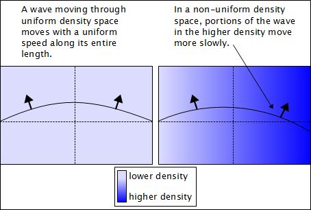 But why would this cause a particle to move toward an area of higher density? The key, as the following diagram illustrates, is that a wave moving through an area of uniform density space will continue on its way unaffected. However, if any portion of that wave were to encounter an area of space with higher density then that portion of the wave would move more slowly than the rest.