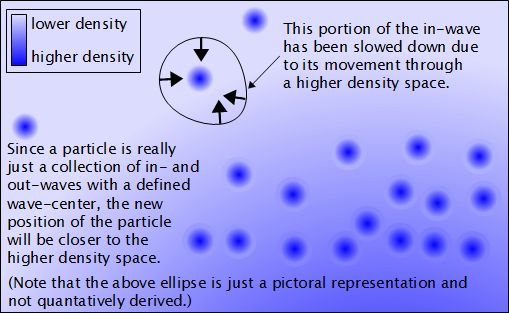Particles are really just areas of space where in-waves are arriving, undergoing spherical rotation and then leaving again as out-waves. If a portion of an in-wave is moving slower than the rest because it is in a higher density space, then already the particle has moved toward the higher density area since the in-wave is a portion of the particle.