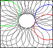 As the animation on the right illustrates, an in-wave is really a collection of separate spherical waves coming from many different particles. At one common edge, all these in-waves form a single wavefront that is the in-wave. In the animation it's where all the waves meet to form a dark, collapsing ring. This is called Huygens principle (or more precisely, the Huygens-Fresnel principle.) The red, blue and green waves in the animation are so colored to help show that the animation is made up of many separate circular waves. So only a small portion of the out-wave of one particle arrives at a second particle as part of that second particle's in-wave. That small part will then be rotated 720 degrees, and returned to the original particle as part of a new, expanding out-wave. |